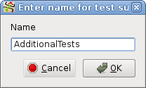 The action pops up with a name dialog for entering the directory name. After entering the name and confirming, the new directory is created in database and file system. In case of test suites, also a data sub directory is provided. For test cases, an actions and expected directory will be created in addition. All directories area created in the database as well as in the file system.