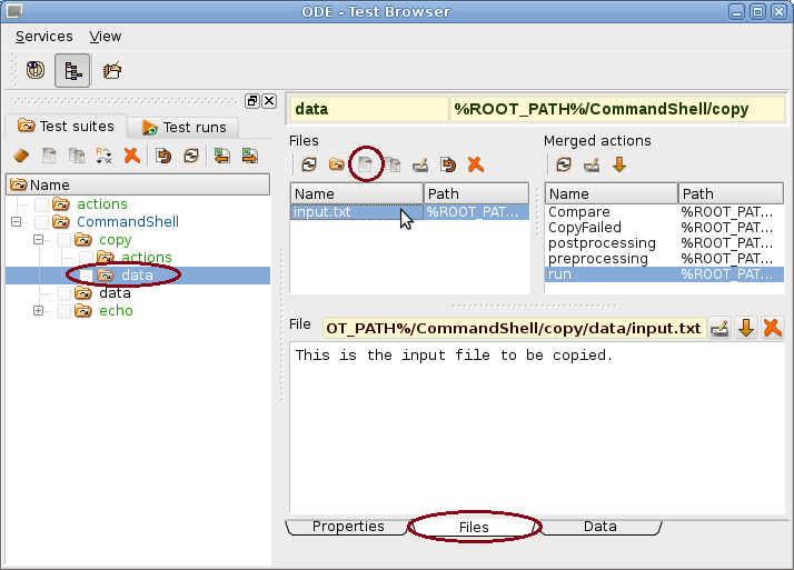 After updating (and localizing) the run action, the data directory below the copy test case directory has to be selected. The "Create new file" action button above the files list may be clicked. After entering the file name and confirming the action, the file appears in the list. In case of text files it may be edited directly in the edit filed below the file path. More complex structured test data may be edited using the edit button left of the file path. In order to copy test data from another location, one may also use the file dialog button above the Files list.