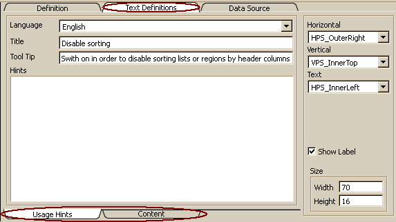 Text definitions may be defined as GUI text definitions, which contain information specific for the GUI context. GUI text definitions can be accessed when activating the Text tab on bottom of text definitions. GUI text definitions should provide information only, which provides usage hints or more detailed explanation about the control and its behavior. Usually, short help is by the tool tip text, which will be enabled when moving the mouse over a control.