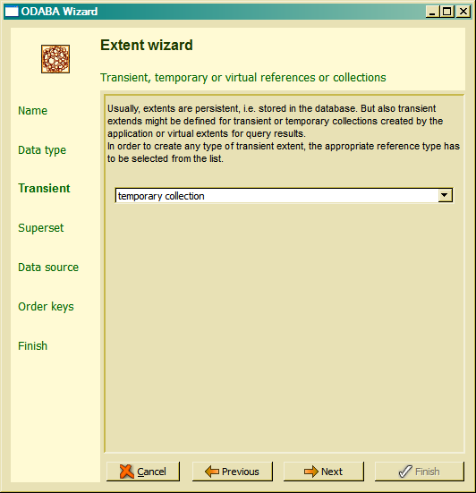 For defining a temporary collection, which stores data in a temporary database, the reference type temporary collection has to be selected. For defining a transient collection storing the collection in memory, the reference type transient collection has to be selected.