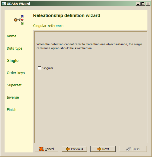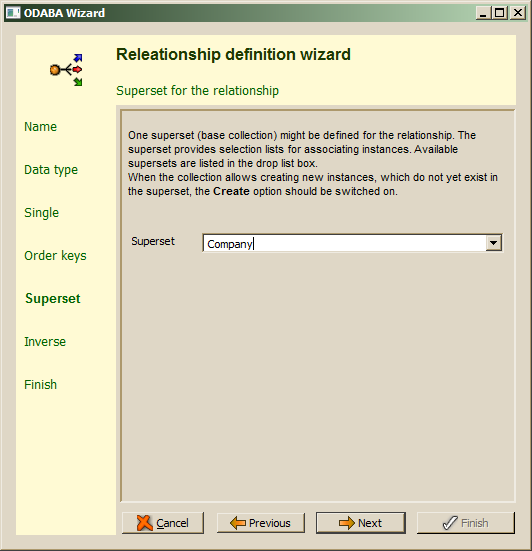 When more than one extents have been defined for the data type, the drop list provides all available extents for the data type. This also includes local collections, which are preceded by a dot'.'. When not defining a superset for the relationship, the relationship is considered to be an owning relationship and referenced instances are deleted when they are removed from the collection or when the owner instance is deleted. In order not to define a superset.the Superset field has to be cleared. before continuing with Next.