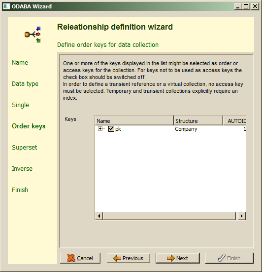 Key definitions for the data type of the relationship are listed as access key candidates. By default, the primary key is selected to be used as access key. One should select, however, only those keys, which are really needed for ordering the relationship collection. In order to maintain base collections properly, the primary key should always be selected.