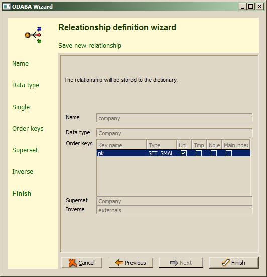 In case that the maximum number of instances in a multiple relationship collection has to be limited to a value greater than 1, the collection size (dimension) has to be updated later in the relation editor form right of the list. When a multiple relationship has been defined, the Next step allows defining access keys (sort orders) for the collection.