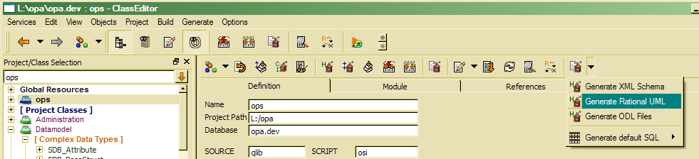 UML class diagrams may be generated from within ClassEditor. Class diagrams are created for all classes belonging to a project or module. When selecting a project or module in the application tree, the work window on the right side shows the project or module properties.