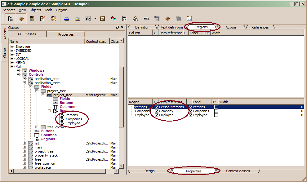 The next step, usually is to assign data sources to fields and regions in the control. In the example, the project tree should show two regions, for Person::Persons and Company::Companies. In order update region data sources, one may select the Main::project_tree control and select Regions on the right side property window.