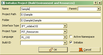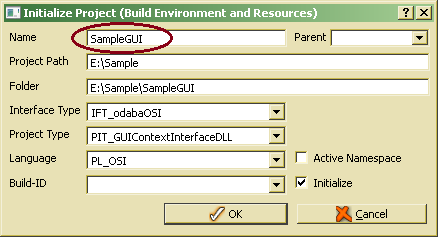 When the Designer starts up, it requires to initialize a project. The project name, e.g. Sample, is usually used for the resource project which is identical with the schema name when loading a database scheme from an ODL file. In order to initialize a GUI context interface project, one should define a name different from the resource project (e.g. SampleGUI).