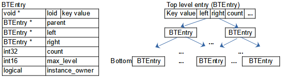 Ordered transient key lists are organized as binary trees, where each node in the tree contains the key value, total of managed bottom entries and a pointer to left (lower or equal key value) and right entry (greater or equal key value).