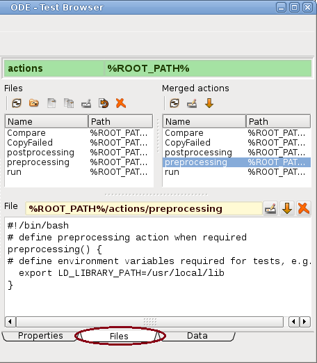 Environment specific actions are preprocessing, run andpostprocessing. Actions delivered with the test environment template are considered as example have to be updated, usually. After selecting the Files tab below the edit window, provided actions are shown:
