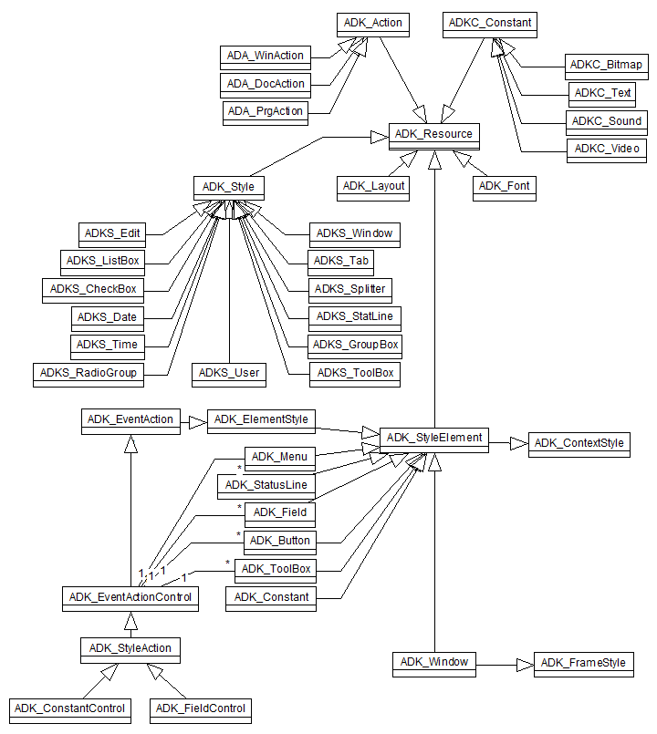 Most ADK resource objects inherit from ADK_Resource. Style objects (ADK_Style) are provided in order to define different control types referring to simple or complex data sources (attributes, complex instances or collections). Style elements (ADK_StyleElement) define the way a control with a given style will be displayed.
