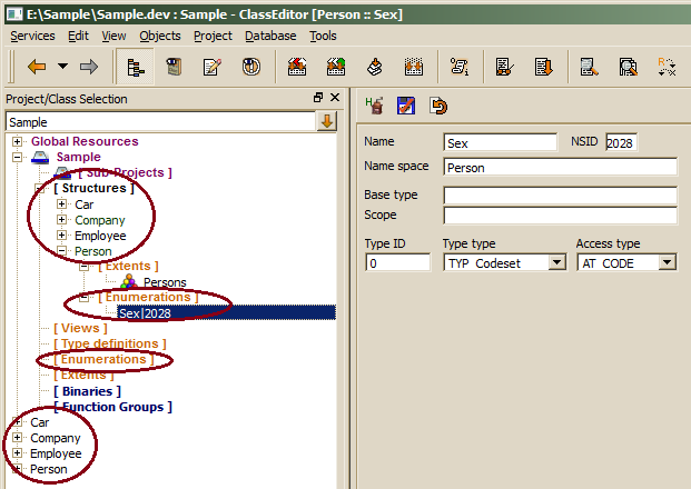 Object model resources are shown in the class tree, which represents complex data types as complex data types (Structures), but also as classes (lower list). Enumerations might be defined as complex data type property (as in the Person definition) or as global enumerations.