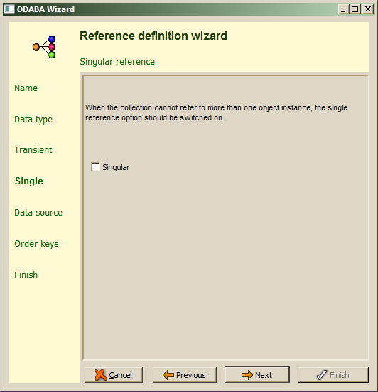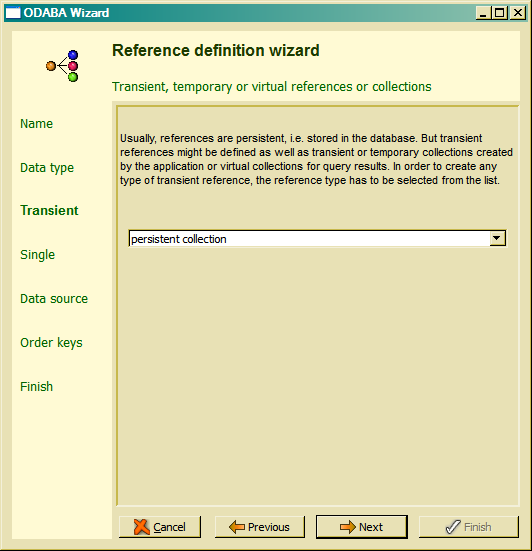 For defining a persistent reference (collection), the reference type persistent collection has to be selected. The Next step allows choosing between a multiple or singular reference.