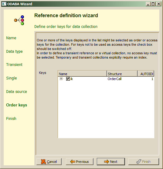 Key definitions for the data type of the reference are listed as access key candidates. By default, the primary key is selected to be used as access key. One should select, however, only those keys, which are really needed for ordering the reference collection. In order to define an unordered collection, all keys in the list should be deselected.