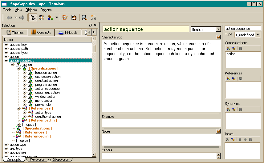Concepts can be defined and maintained in the Concepts view of Terminus. In the tree, concepts and related concepts (generalization and specialization) are displayed as well as related topics.