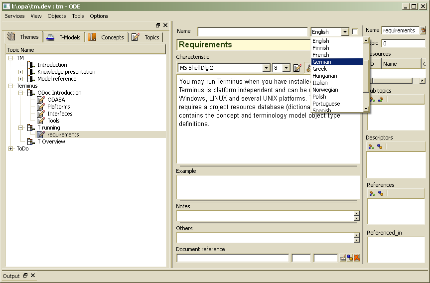 All topics and concept definition text blocks provide the language selection box, which selects the language for all text parts in the topic (characteristic, example, notes and others). Links to other topics or concept relations (generalisation, descriptors, references) are not language dependent but might be displayed with language specific texts.