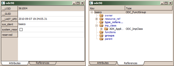 The generic window displays the attribute and MEMO properties in a transposed table view (left). When the data source has been opened in write mode, attribute values might be updated. The second tab displays the references and relationships. Owning references/relationships are displayed with bold face letters.