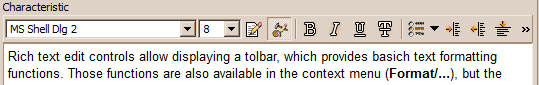 Rich text edit controls allow displaying a toolbar, which provides basic text formatting functions. Those functions are also available in the context menu (Format/...), but the toolbar is more comfortable and provides two additional functions. All text formatting options apply on the selected text. Some functions (as Top margin or Indent) apply on paragraph settings.
