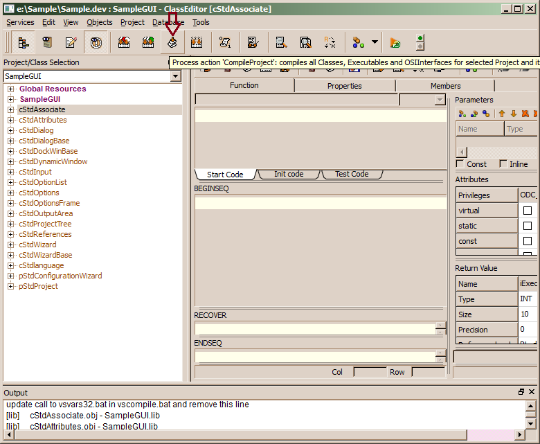 The compiler output will be displayed in the output area on the bottom of the ClassEditor. Since output will be displayed when the process terminated, i.e. after compiling all classes, it may take a while, until the message appears.