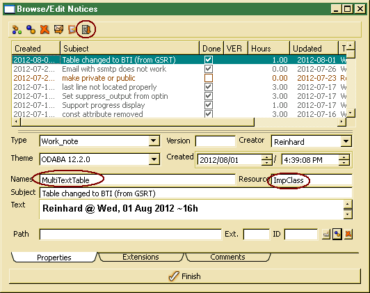 Notices are always a good mean for tracking changes. Each development resource shows always a list of all changes made for the resource. Thus, one may either check for notices directly when working on a resource, but one may also track changes and activities by time in the active notice list. The notice list may be opened by selecting Objects/Notices from the main menu in any of the ODE tools.